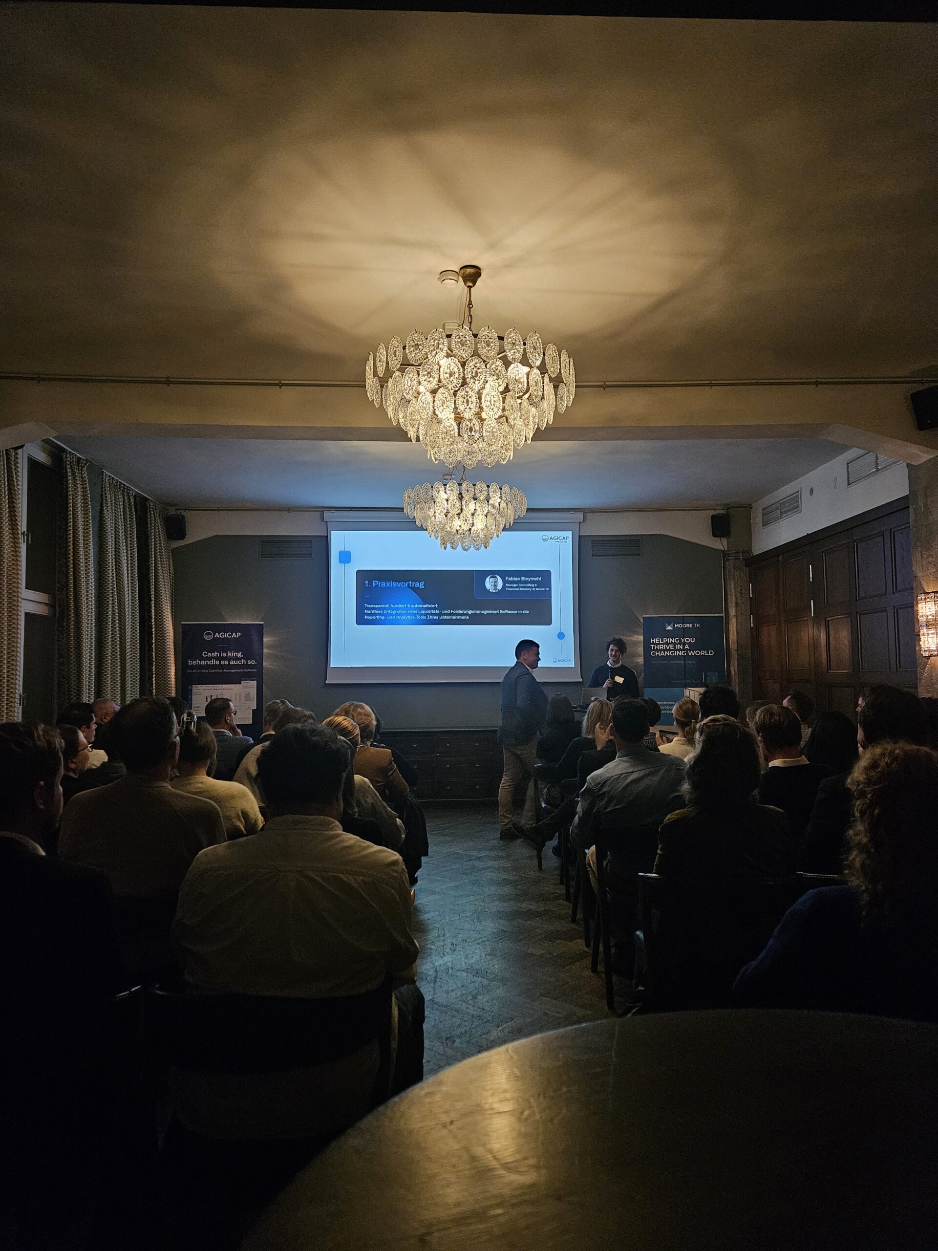 Im Mittelpunkt stand der Praxisvortrag unseres Kollegen Fabian Bleymehl zur nahtlosen Integration von Liquiditäts- und Forderungsmanagement-Software in bestehende Reporting- und Analytics-Strukturen. Ergänzt wurde das Programm durch die Vorstellung einer aktuellen Marktstudie von Agicap, die zentrale Trends und Lösungsansätze für KMUs beleuchtete.