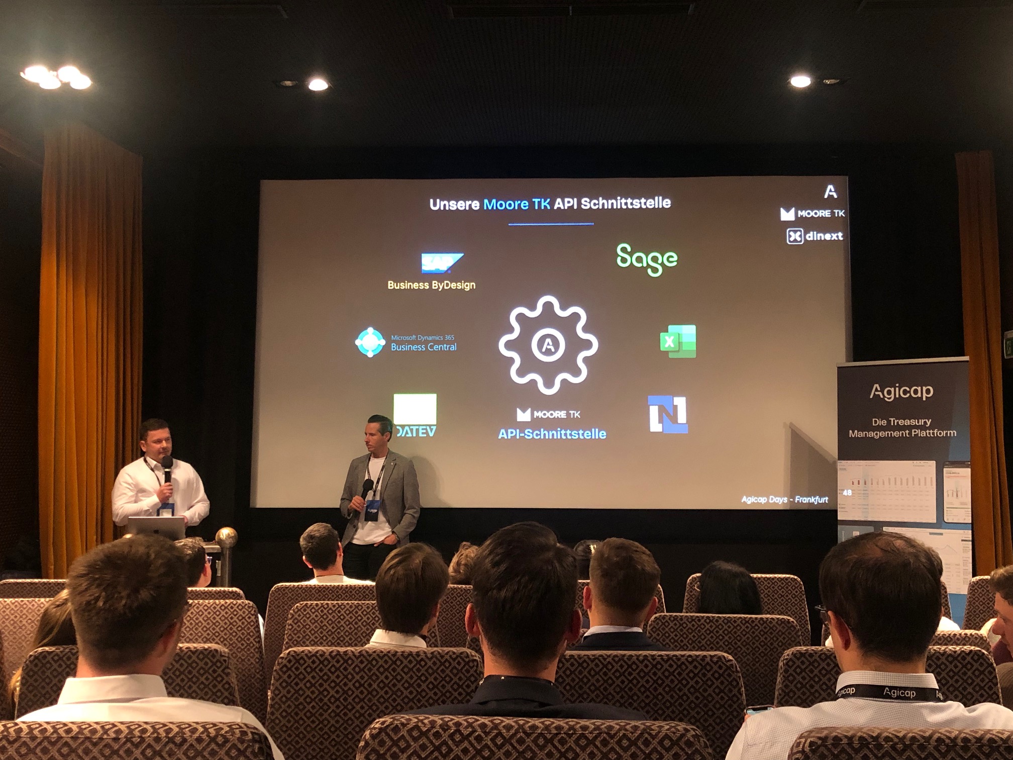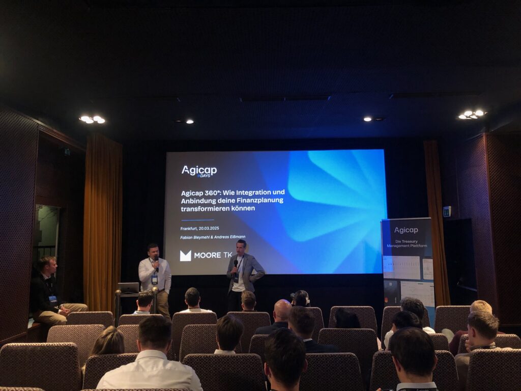Im Mittelpunkt des Abends stand der Praxisvortrag „Agicap 360°: Wie Integration und Anbindung deine Finanzplanung transformieren können“. Unser Kollege Fabian Bleymehl und Andreas Eißmann von Dinext zeigten eindrucksvoll, wie ERP-Systeme wie SAP mithilfe der Moore TK Agicap API nahtlos in Agicap integriert werden können. Die Teilnehmenden erhielten wertvolle Einblicke, wie Automatisierungslösungen die Effizienz und Präzision von Finanzprozessen nachhaltig steigern können. Zusätzlich präsentierte Agicap eine aktuelle Marktstudie zu Finanz- und Cashflow-Herausforderungen für KMUs, die rege diskutiert wurde. Die Kombination aus praktischen Insights und fundierten Studienergebnissen schuf die Basis für eine angeregte und produktive Diskussionsrunde.